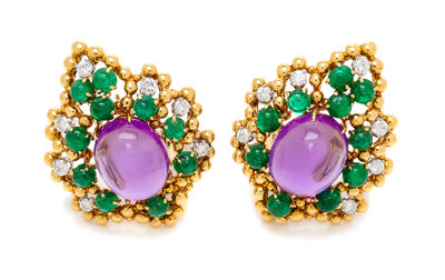 A Pair of Yellow Gold, Platinum, Amethyst, Emerald and Diamond Earclips, David Webb, 18.50 dwts.
