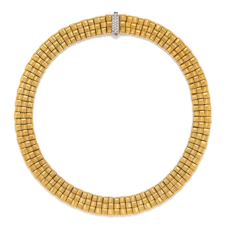 in a three row basket weave pattern, the clasp containing 19 round brilliant cut diamonds weighing approximately 0.20 carat total.Stamp: ROBERTO COIN 750.