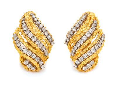 A Pair of 18 Karat Bicolor Gold and Diamond Earclips, 16.60 dwts.