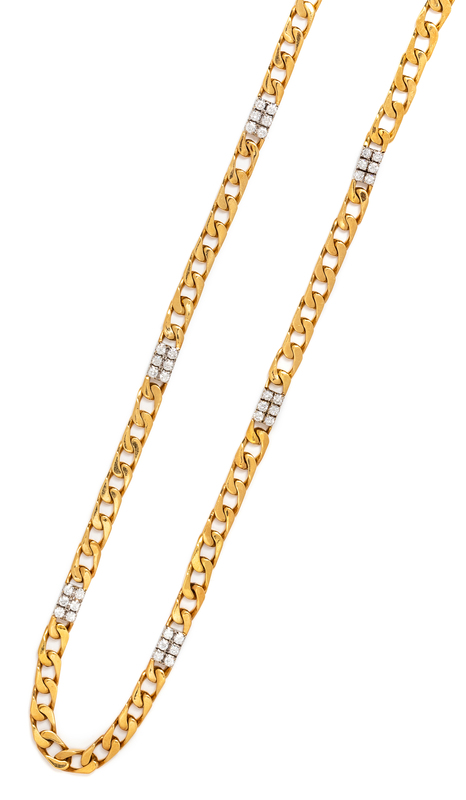 consisting of a yellow curb link chain with six white gold spacers containing 36 round brilliant cut diamonds weighing approximately 4.60 carats total.