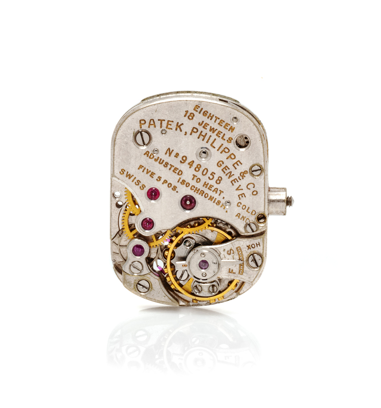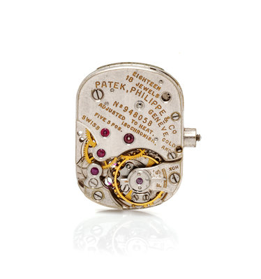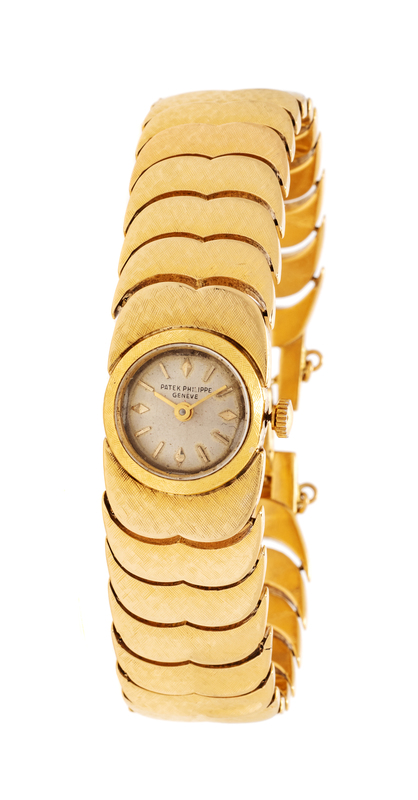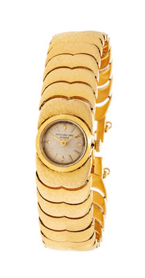 17.00 mm case diameter, matte silvered dial signed PATEK PHILIPPE, applied gold index and baton numerals, gold baton hands, snap on case back, later quartz movement, integrated textured wave link bracelet, fold over clasp.Clasp stamp: 18K.Inner case back stamp: PATEK PHILIPPE & Co. GENEVE SWISS 0.750 692245 3215.Accompanied by the original loose Cal. 7-70 18 jewel manual wind movement adjusted to heat, cold and isochronism and five positions signed PATEK PHILIPPE & Co.Movement number: 948058.