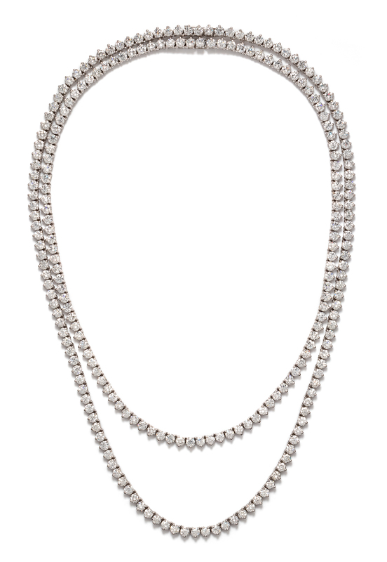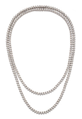 consisting of one necklace containing 109 round brilliant cut diamonds weighing approximately 20.00 carats total together with a necklace containing 129 round brilliant cut diamonds weighing approximately 22.50 carats total that can be worn separately or combined.Stamp: 750.