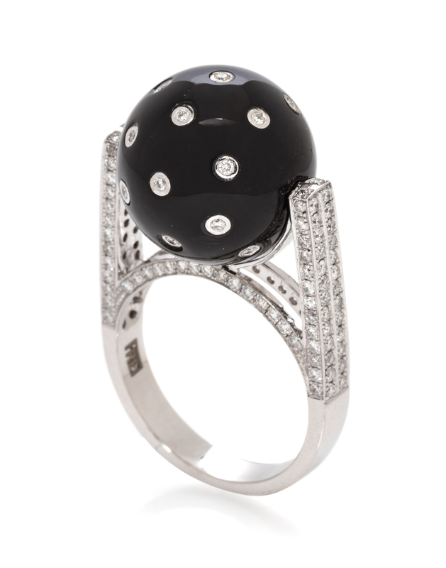 consisting of a spinning onyx sphere measuring approximately 14.85 mm in diameter surmounted with numerous round brilliant cut diamonds, the ring containing 158 round brilliant cut diamonds total weighing approximately 0.80 carat total.Stamp: FREI 18K.