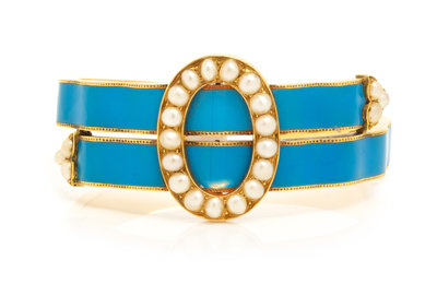 consisting of a blue enamel belt motif containing 23 pearls (origin not tested) measuring approximately 3.35-3.65 mm in diameter, hinged with side clasp.