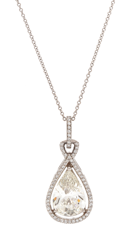 containing one pear shape brilliant cut diamond weighing 3.07 carats and 21 round brilliant cut diamonds weighing approximately 0.65 carat total, suspended from an 18 karat white gold cable link chain measuring approximately 1.10 mm wide.Stamp: PT 950 (maker's mark) 89056.Clasp stamp: 18KT ITALY.Accompanied by a Gemological Institute of America diamond grading report number 10245068, dated March 29, 2019, stating Color: J, Clarity: VS2, Table: 53%, Depth: 56%, Polish: Very Good, Symmetry: Good, Fluorescence: None.