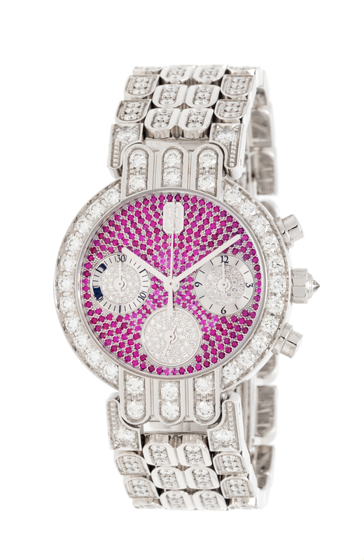 the bezel and lugs containing 34 round brilliant cut diamonds weighing approximately 1.55 carats total, 32.00 mm case diameter, pave ruby dial signed HW, white gold baton hands with center chronograph hands, subdials at 3, 6, and 9 o'clock for chronograph hours, small seconds and minutes respectively, round chronograph pushers at 2 and 4 o'clock, snap on case back, quartz movement, link bracelet containing 184 round brilliant cut diamonds weighing approximately 4.60 carats total, double deployant clasp.Case back stamp: HARRY WINSTON No 1351 200UCQ32W 023051 750.Accompanied by inner case and outer box signed HARRY WINSTON.