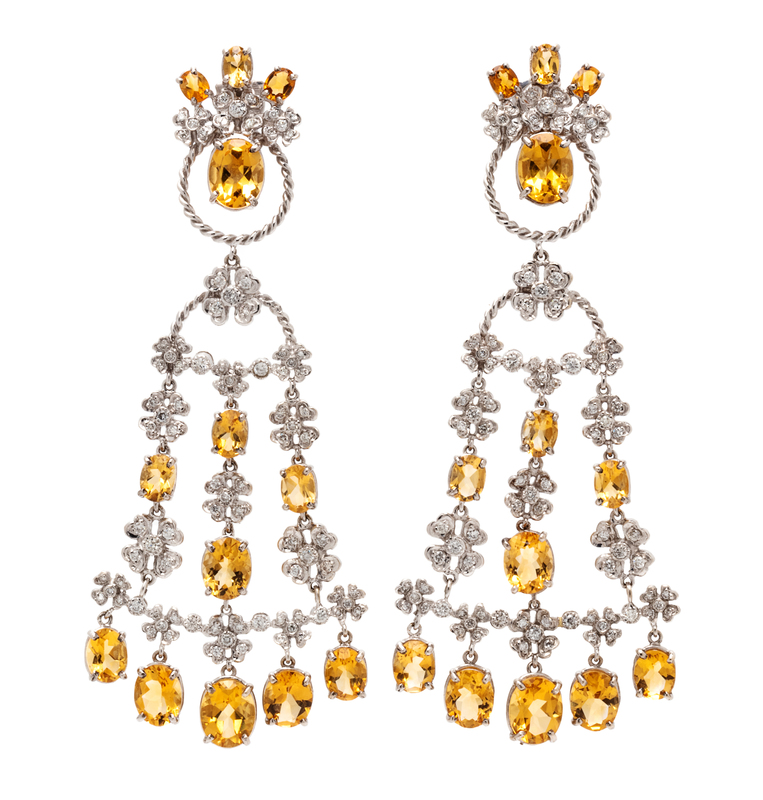 A Pair of 18 Karat White Gold, Citrine and Diamond Chandelier Earclips, 31.30 dwts.