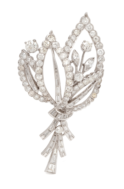 containing four old European cut diamonds weighing approximately 1.00 carat total, two marquise cut diamonds weighing approximately 0.35 carat total, 68 old European and single cut diamonds weighing approximately 3.00 carats total and 35 baguette cut diamonds weighing approximately 1.15 carats total.