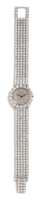 the bezel containing 18 round brilliant cut diamonds weighing approximately 2.50 carats total, 24.00 mm case diameter, dial containing numerous round brilliant cut diamonds signed Chopard, black baton hands, case back affixed with six screws, quartz movement, integrated bracelet with fold over clasp containing 291 round brilliant cut diamonds weighing approximately 16.00 carats total.Case back stamp: Chopard 105728 (Swiss hallmarks) 515533 911 1.