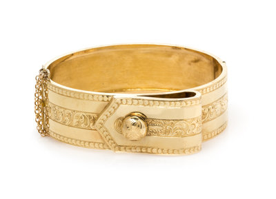 A Victorian 18 Karat Yellow Gold Buckle Motif Bangle Bracelet, L. Larsson & Co., Circa 1872, 14.50 dwts.
