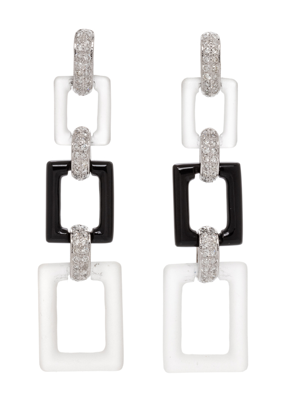 A Pair of 18 Karat White Gold, Rock Crystal, Onyx and Diamond Earrings, 5.00 dwts.