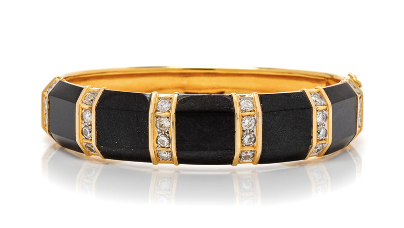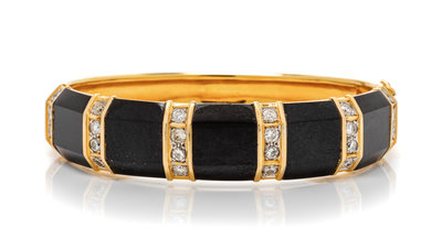 An 18 Karat Yellow Gold, Diamond and Onyx Bangle Bracelet, 35.10 dwts.
