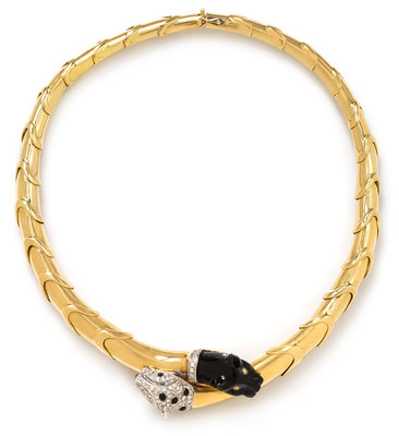 consisting of a white gold panther and a carved onyx jaguar head bypass design containing approximately 83 round brilliant cut diamonds weighing approximately 1.20 carats total, two round mixed cut emeralds measuring approximately 1.30 mm in diameter and black enamel details, hinged hard link collar.Stamp: 18Kt (Italian hallmark).