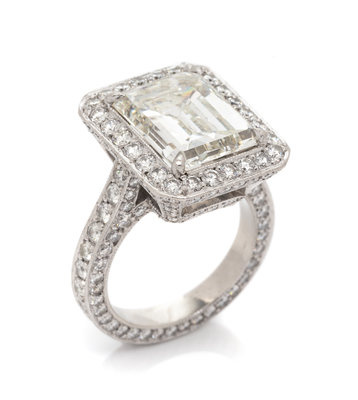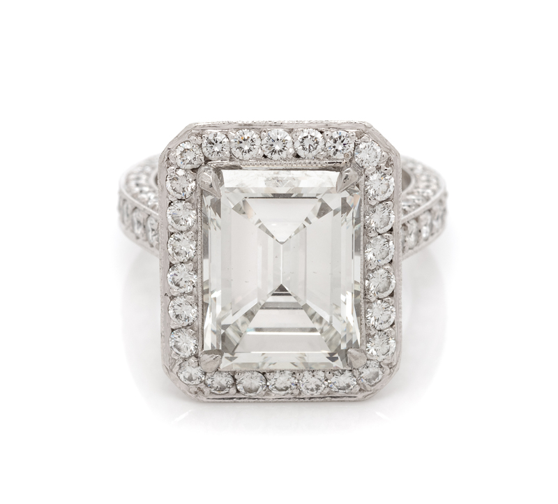 containing one octagonal step cut diamond weighing 5.59 carats and numerous round brilliant cut diamonds weighing approximately 2.30 carats total.Stamp: (MKJ maker's mark).Accompanied by a Gemological Institute of America diamond grading certificate number 14555678, dated April 1, 2019, stating Color: J, Clarity: SI1, Polish: Very Good, Symmetry: Good, Fluorescence: None.