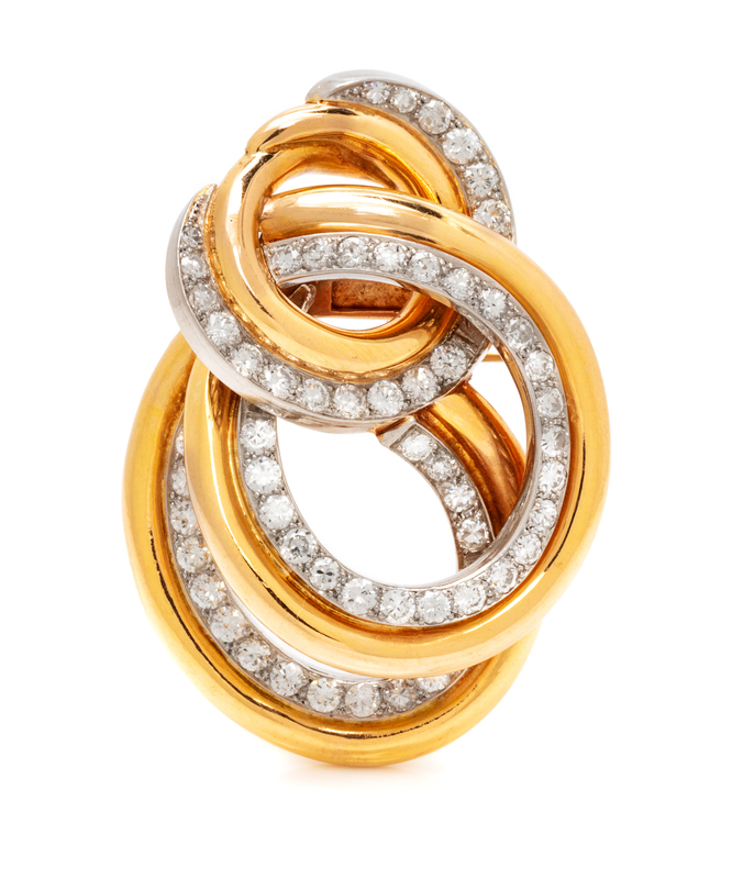 A Yellow Gold, Platinum and Diamond Swirl Brooch, 17.10 dwts.