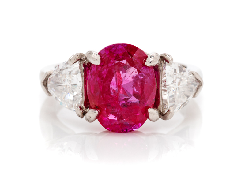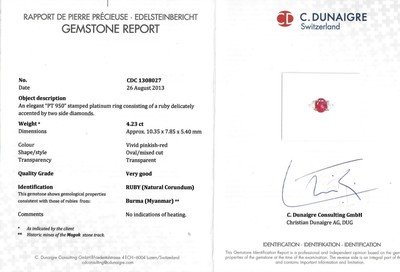containing one oval shape mixed cut ruby measuring approximately 10.35 x 7.85 x 5.40 mm and two triangular brilliant cut diamonds weighing approximately 1.30 carats total. Stamp: PT950 HANDMADE. Accompanied by a C. Dunaigre Laboratory ruby gemstone report number CDC 1308027, dated August 26, 2013, stating Mineral Type: Ruby (Natural Corundum), Origin: Burma (Myanmar), Enhancement: No indications of heating.