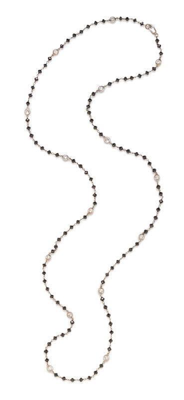consisting of numerous rondelle black diamond (origin of color not tested) beads measuring approximately 3.35-3.50 mm in diameter alternating with 15 round brilliant cut diamonds weighing approximately 1.80 carats total.Stamp: 750.