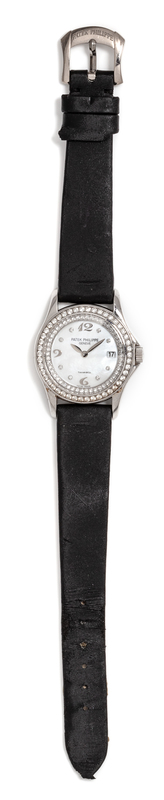 the bezel containing 96 round brilliant cut diamonds weighing approximately 0.85 carat total, 28.00 mm case diameter, mother-of-pearl dial signed PATEK PHILIPPE TIFFANY & Co., applied diamond and white gold Arabic numerals, white gold feuille hands, date aperture at 3 o'clock, screw on case back, quartz movement, black satin strap signed PATEK PHILIPPE, 18 karat white gold tang buckle signed PATEK PHILIPPE.Case back stamp: (Swiss hallmarks) 750 PPCo.Clasp stamp: (Swiss hallmark) PPCo. 750.Accompanied by booklets, inner case and outer box signed PATEK PHILIPPE.