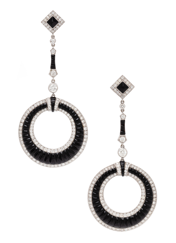 A Pair of 18 Karat White Gold, Diamond and Onyx Earrings, 10.00 dwts.