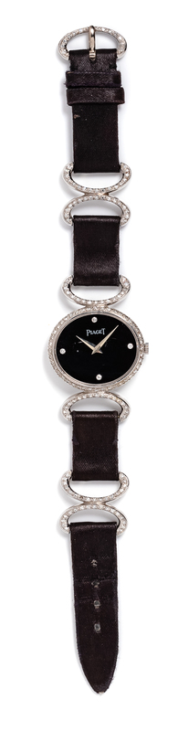 27.00 x 23.50 mm case dimensions, black dial signed PIAGET, diamond numerals, white gold pitched dauphine hands, case back affixed with two screws, Cal. 9P2 manual wind 21 jewel mechanical movement adjusted to temperature and five positions signed PIAGET, white gold case, links and tang buckle containing numerous round single cut diamonds alternating with a sectional black satin leather lined strap signed PIAGET.Movement number: 7615972.Inner case back stamp: PIAGET SWISS 0.750 cp 350.Case back stamp: 9802 D B 282558.Clasp stamp: PIAGET 0.750.