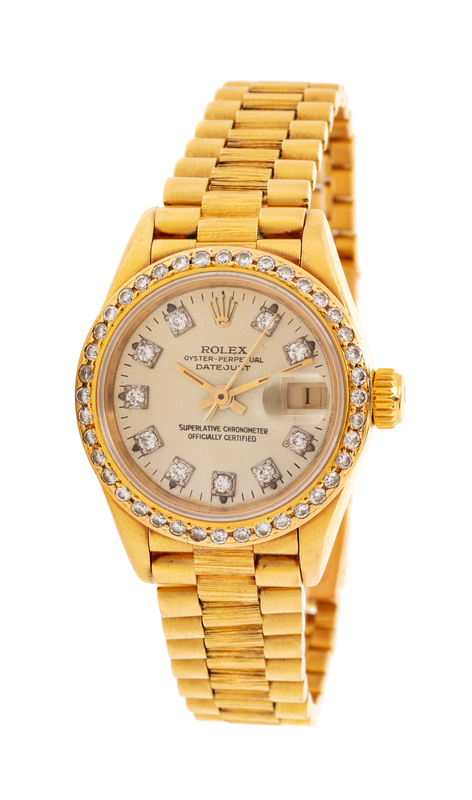 the later bezel containing 40 round brilliant cut diamonds, 26.00 mm case diameter, champagne dial signed ROLEX, diamond numerals, luminous gold baton hands with center sweep seconds hand, date aperture at 3 o'clock with magnifier crystal in window, polished tonneau case, screw back case, Cal. 2135 29 jewel movement signed ROLEX, bark texture and polished President link bracelet, deployant clasp.Serial number: 6900201.