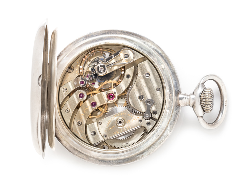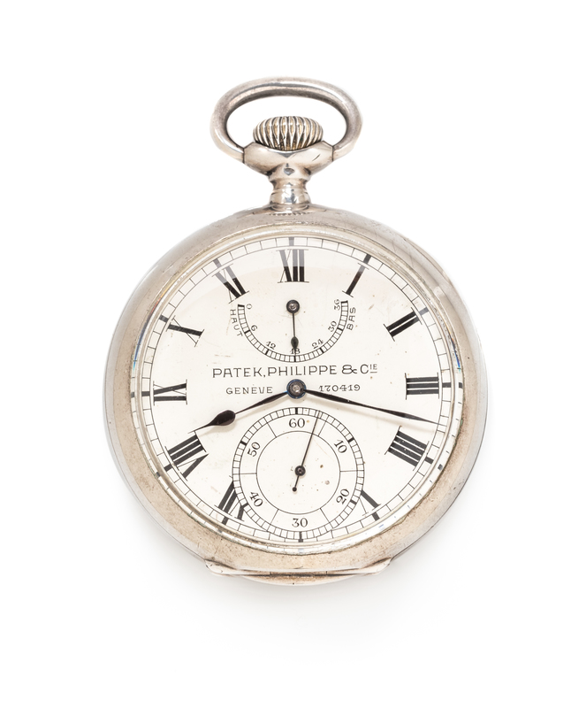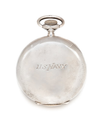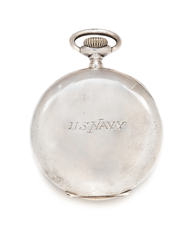 60.00 mm case diameter, matte silver dial signed PATEK, PHILIPPE & CIE, GENEVE 170419, Roman numerals with outer minute track, 36 hour power reserve indicator at 12 o'clock, subdial for seconds at 6 o'clock, blued steel spade hands, coin polished bezel, polished circular case back engraved U.S. NAVY, polished cuvette, Cal. 21 manual wind nickel finish jeweled EXTRA movement signed PATEK, PHILIPPE & Co No 170419 GENEVE and numbered twice.Movement number: 170419.Inner case back: 0.900 274695 (hallmark) P.P.Co.Inner cuvette case back: 0.900 274695 (hallmark) P.P.Co.Accompanied by a fitted wooden case.Additional Note:For a rare set of three Patek Philippe silver pocket watches with Movement No.'s 170'414, 170'416, 170'417, Case No.'s 274'699, 274'701, 274'693, please see:Christies's: An Evening of Exceptional WatchesNew YorkDecember 7, 2017