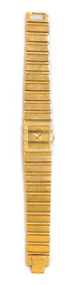 20.00 x 20.00 mm case dimensions, alternating brushed and fluted gold dial signed PIAGET, pitched gold dauphine hands, square case and integrated link bracelet in alternating brushed and polished finish, case back affixed with four screws, quartz movement.Case back stamp: 8131 C 701 37992.Accompanied by a case signed PIAGET.