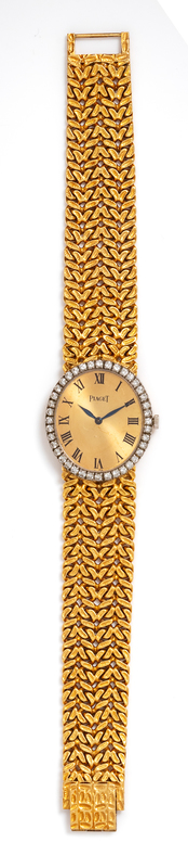 the bezel containing 40 round brilliant cut diamonds weighing approximately 0.70 carat total, 23.00 x 27.00 mm case dimensions, matte gold dial signed PIAGET, Roman numerals, blue steel feuille hands, case back attached by two screws, Cal. 9P 18 jewel manual wind nickel movement adjusted to five positions and temperture signed PIAGET, integrated textured helix link bracelet, fold over clasp.Movement number: 681235.Inner case back stamp: PIAGET SWISS 0.750 (hallmarks) 81.Case back stamp: 9826 N 21 147017.Clasp stamp: MODELE DEPOSE PIAGET 750.