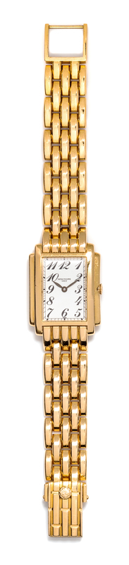22.00 x 28.50 mm case dimensions, white dial signed PATEK PHILIPPE, black Arabic numerals, blued steel feuille hands, rectangular curved stepped case, case back affixed with four screws, Cal. E15 six jewel quartz movement with one adjustment, integrated brick link bracelet, fold over clasp.Movement number: 1623649.Inner case back number: 2962398 4824/1.Case back stamp: (Swiss hallmarks).