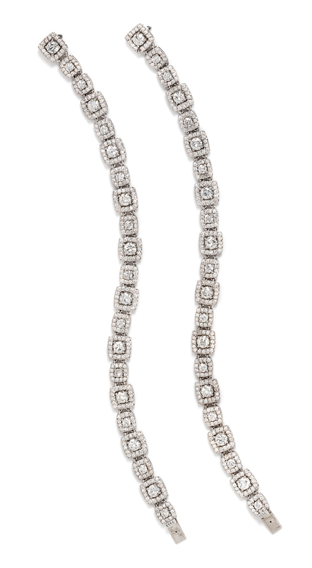 consisting of a bracelet containing 21 round brilliant cut diamonds weighing approximately 3.20 carats total and numerous round brilliant cut diamonds weighing approximately 1.45 carats total, together with a matching bracelet containing 21 round brilliant cut diamonds weighing approximately 3.20 carats total and numerous round brilliant cut diamonds weighing approximately 1.45 carats total, bracelets can be worn together combined as a necklace.