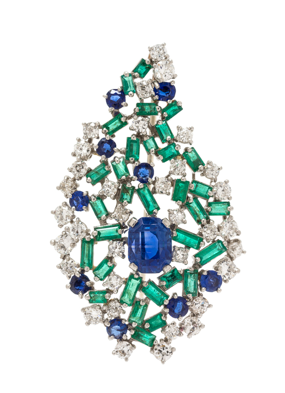 A Platinum, Sapphire, Emerald and Diamond Brooch, 12.30 dwts.