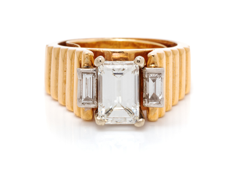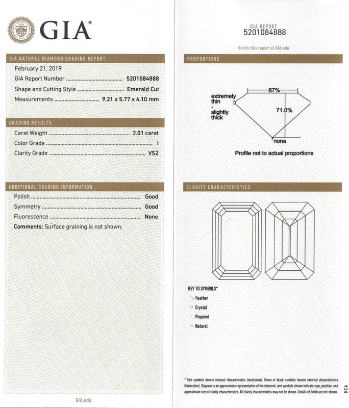 containing one octagonal step cut diamond weighing 2.01 carats and two baguette cut diamonds weighing approximately 0.35 carat total.Accompanied by a Gemological Institute of America diamond grading certificate number 5201084888, dated February 21, 2019, stating Color: I, Clarity: VS2, Polish: Good, Symmetry: Good, Fluorescence: None.