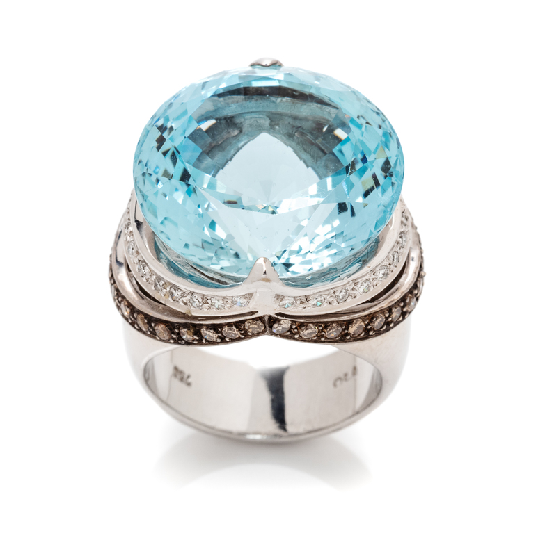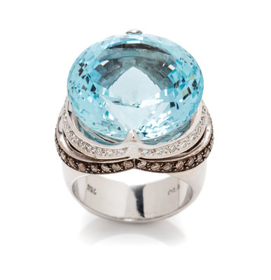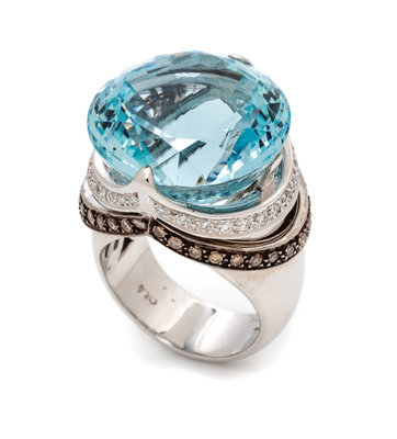 containing one round mixed cut aquamarine measuring approximately 19.70 x 19.80 x 13.10 mm, 30 round brilliant cut diamonds weighing approximately 0.25 carat total and 35 round brilliant cut brown colored diamonds (origin of color not tested) weighing approximately 0.55 carat total.Stamp: 750 (obscured).