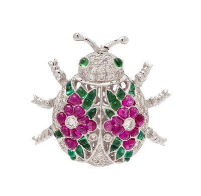An 18 Karat White Gold, Ruby, Emerald and Diamond Articulated Insect Brooch, 5.00 dwts.