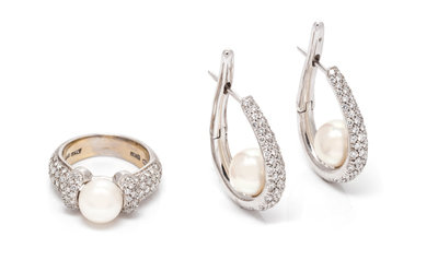 consisting of a pair of hoop earrings containing two pearls measuring approximately 9.40 mm in diameter and 94 round brilliant cut diamonds weighing approximately 1.10 carats total by Mikimoto, together with a ring containing one pearl measuring approximately 8.55 mm in diameter and 92 round brilliant cut diamonds weighing approximately 1.20 carats total.Earring stamp: (maker's mark for Mikimoto) MADE IN ITALY (Italian hallmark) 750.Ring stamp: 18Kt ITALY 750 (Italian hallmark).