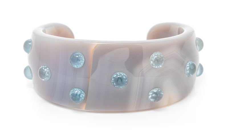 consisting of a solid carved banded grey agate cuff dotted with 13 round cabochon cut aquamarines measuring approximately 6.30-6.35 mm in diameter.