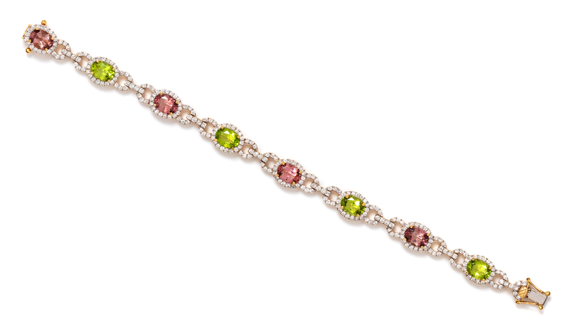containing four oval shape mixed cut pink topaz measuring approximately 8.00 x 6.00 x 3.70 mm, four oval shape mixed cut peridot measuring approximately 8.00 x 6.05 x 4.15 mm and 242 round brilliant cut diamonds weighing approximately 2.50 carats total.Stamp: JPM 14K.