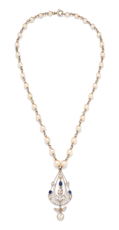 An Edwardian Platinum, Diamond and Sapphire Pendant and White Gold and Cultured Pearl Necklace, 10.80 dwts.