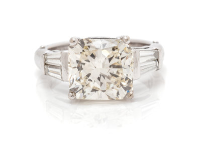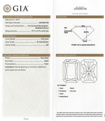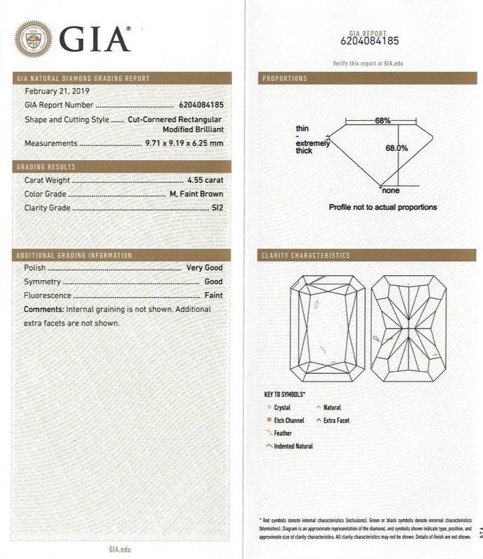 containing one cut-cornered rectangular modified brilliant cut diamond weighing 4.55 carats and four tapered baguette cut diamonds weighing approximately 0.60 carat total.Stamp: FINGERMATE 14.Accompanied by a Gemological Institute of America diamond grading certificate number 6204084185, dated February 21, 2019, stating Color: M, Faint Brown, Clarity: SI2, Polish: Very good, Symmetry: Good, Fluorescence: Faint.