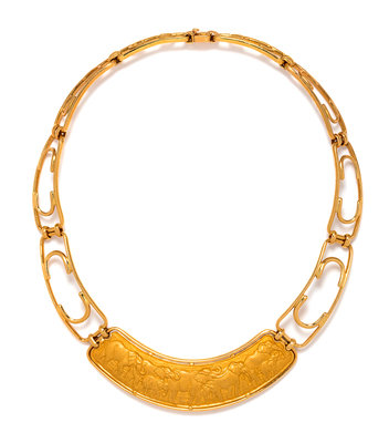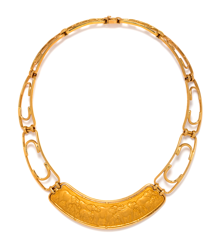 consisting of a curved plaque of matte and polished gold relief elephants within a graduated link necklace.Stamp: (maker's mark for Carrera y Carrera) MCD 750.