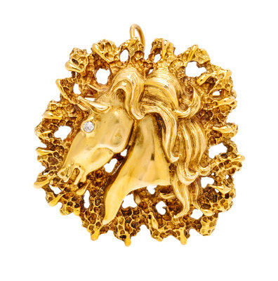 A 14 Karat Yellow Gold and Diamond Horse Head Pendant/Brooch, La Triomphe, 24.50 dwts.