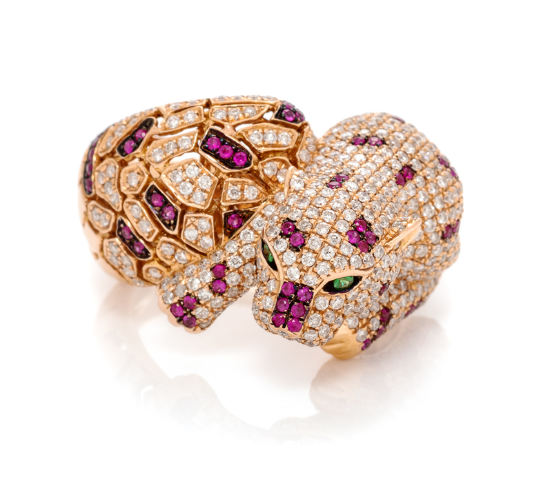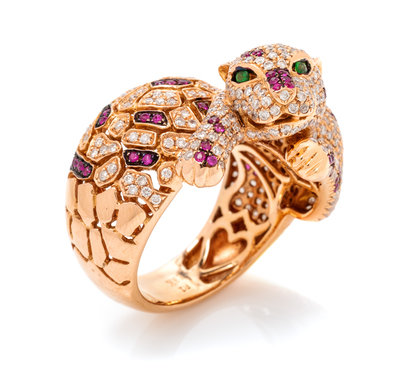 An 18 Karat Rose Gold, Diamond, Ruby and Tsavorite Garnet Panther Motif Ring, 8.75 dwts.