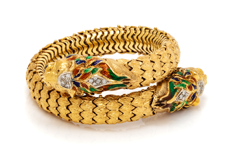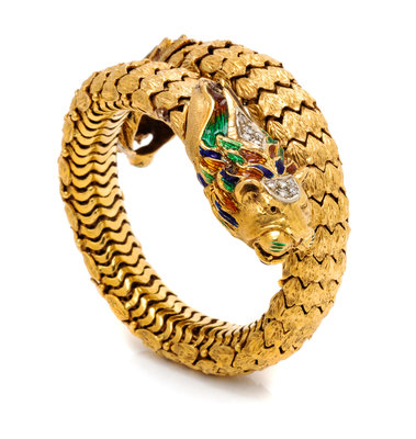 consisting of a flexible bypass bracelet with lion head terminals containing 20 round brilliant cut diamonds weighing approximately 0.15 carat total and green, blue and orange enamel detail. Stamp: 750.