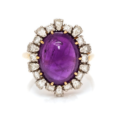 containing one oval shape cabochon cut amethyst measuring approximately 14.90 x 11.20 mm, 20 pear shape diamonds weighing approximately 1.30 carats total, and 20 round brilliant cut diamonds weighing approximately 0.60 carat total.Stamp: (4831 scratchmark) IDE PLAT. 14K.