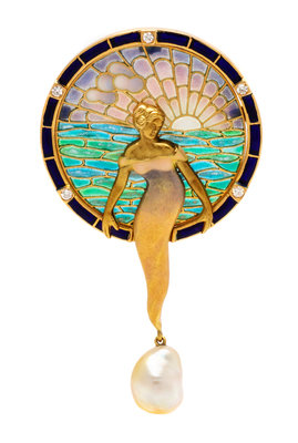 An 18 Karat Yellow Gold, Plique-a-Jour, Diamond and Cultured Baroque Pearl 'Moon Goddess' Pendant/Brooch, Nouveau 1910, 16.65 dwts.