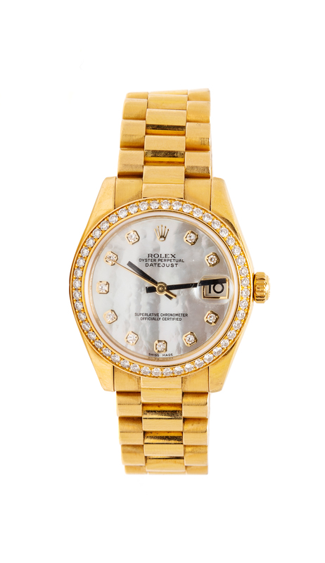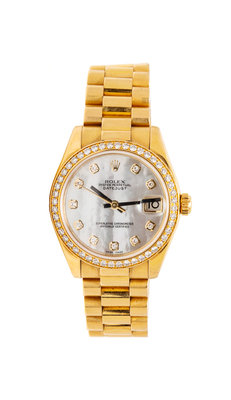 the bezel containing 46 round brilliant cut diamonds weighing approximately 1.00 carat total, 31.00 mm case diameter, mother-of-pearl dial signed ROLEX, applied diamond numerals, black baton hands with center sweep seconds, date aperture at 3 o'clock with magnifier in crystal, tonneau case, screw down crown with embossed Rolex emblem, screw on case back, self-winding 31 jewel movement signed ROLEX, polished President link gold bracelet, deployant clasp.Serial number: M810869.