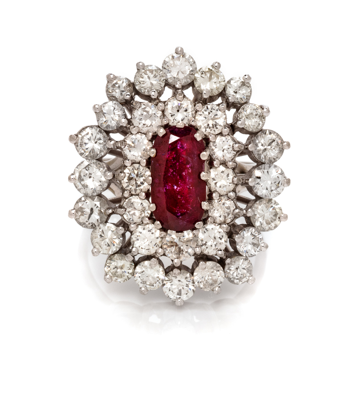 containing one elongated cushion shape mixed cut ruby weighing approximately 1.55 carats and 32 round brilliant cut diamonds weighing approximately 4.20 carats total.