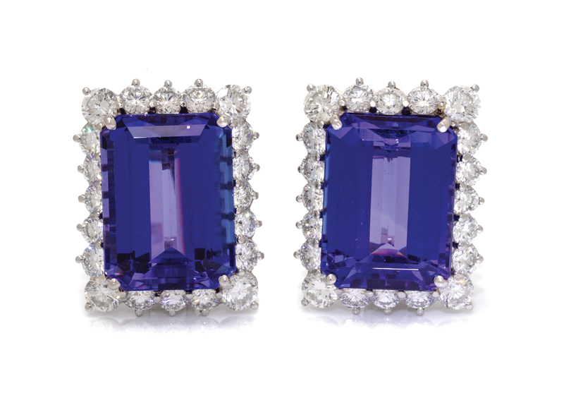 containing two octagonal step cut tanzanites measuring approximately 17.60 x 13.10 x 7.75 mm and 40 round brilliant cut diamonds weighing approximately 5.45 carats total, folding posts with clip backs.Stamp: PLAT.