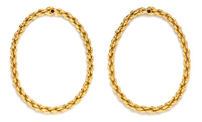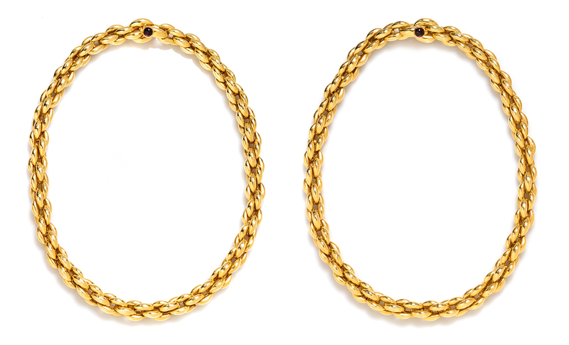 consisting of two sections that can be worn as separate necklaces or combined, elongated popcorn link design, the clasps containing two round cabochon cut garnets. Stamp: 18Kt Italy NM.