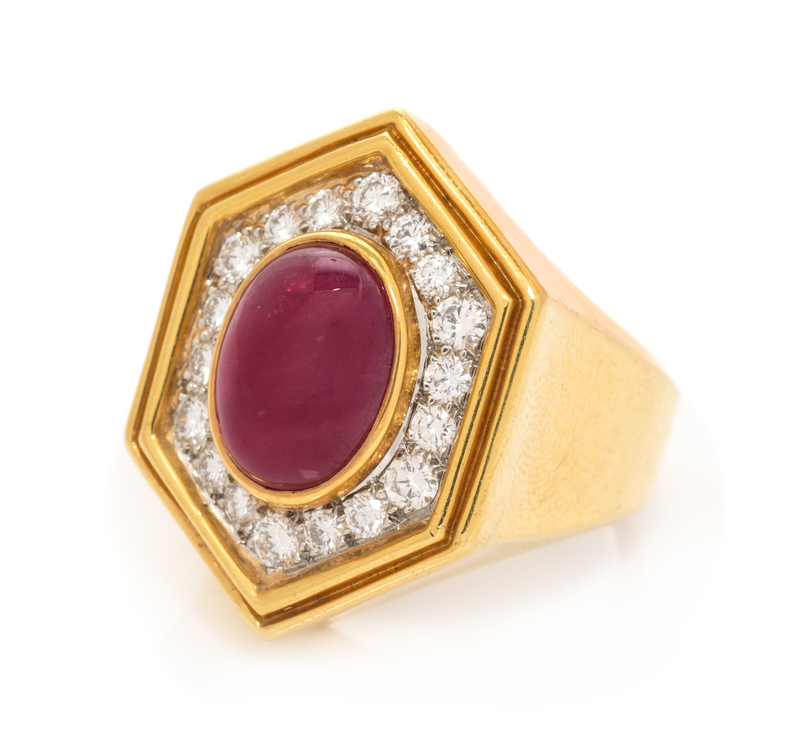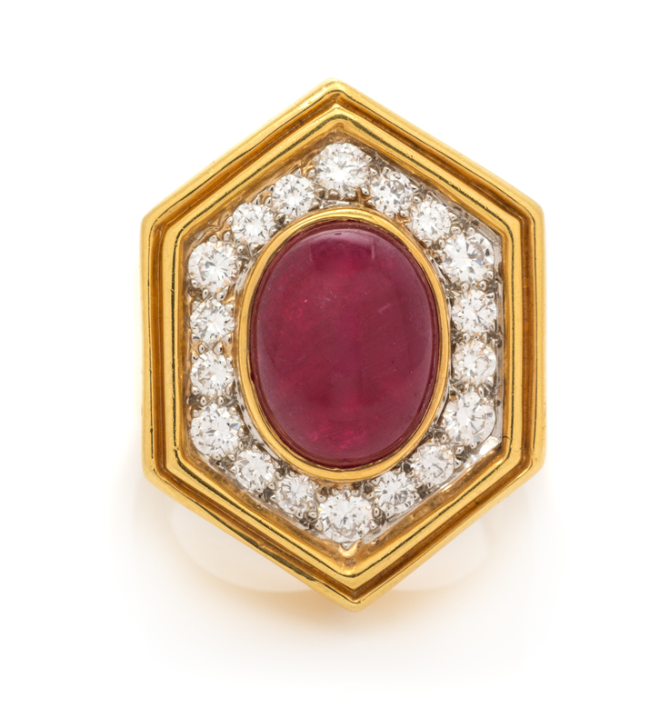 containing one oval shape cabochon cut ruby measuring approximately 11.55 x 8.75 x 5.45 mm and 18 round brilliant cut diamonds weighing approximately 1.10 carats total.Stamp: 18K R3177.